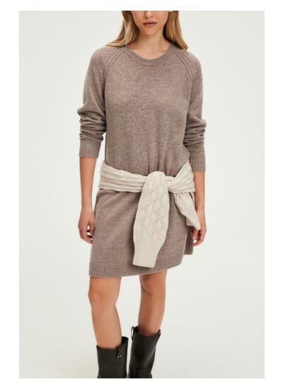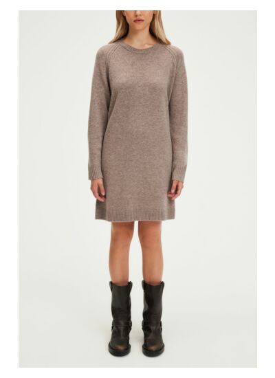 Cette robe courte en 100% laine est le choix parfait pour celles qui recherchent à allier confort et élégance au quotidien. Sa coupe droite et ses finitions bord-côtes lui confèrent une allure moderne et raffinée, tandis que l'emmanchure raglan et le col rond ajoutent une touche de sophistication. La fente d'aisance sur le côté gauche permet une liberté de mouvement, idéale pour les journées actives.