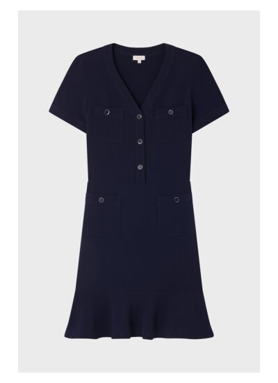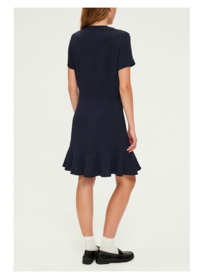 Adoptez un style chic et intemporel avec cette robe courte en crêpe à volants, parfaite pour les occasions décontractées ou les sorties élégantes. Sa coupe légèrement cintrée et sa jupe évasée mettent en valeur la silhouette tout en offrant un confort optimal. Le col en V et les manches courtes ajoutent une touche de féminité, tandis que les quatre poches plates ornées de boutons marine et doré apportent une note d'originalité.