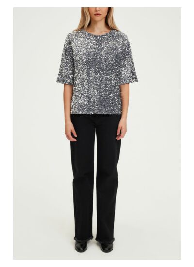 Ajoutez une touche d'éclat à votre garde-robe avec ce top à sequins argentés, parfait pour illuminer vos soirées. Sa forme droite flatte toutes les silhouettes, tandis que le motif scintillant attire tous les regards. Avec son col rond et ses manches courtes, ce top allie confort et élégance, idéal pour une sortie entre amis ou un événement festif. Imaginez-vous briller sur la piste de danse, ou simplement lors d'un dîner chic, en portant ce vêtement qui respire la joie et la convivialité.