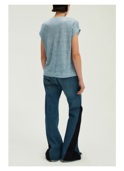 T-shirt en 100% lin aux manches très courtes et aux épaules froncées dans un esprit contemporain. Coloris bleu ciel.