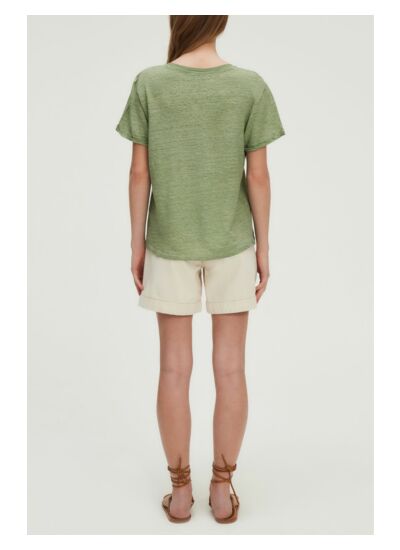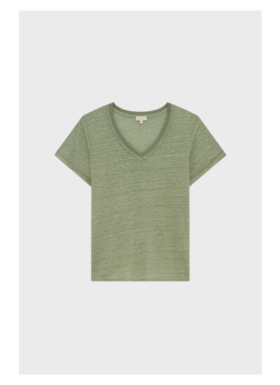 T-shirt à col V en 100% lin cool and dye à l'aspect légèrement blanchi. Coloris vert lychen à marier avec des teintes claires comme foncées.