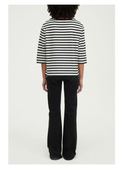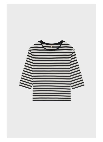 Adoptez un style intemporel avec ce T-shirt à col rond, parfait pour les journées mi-saison. Son motif à rayures évoque l'élégance des marins, tout en ajoutant une touche de fraîcheur à votre garde-robe. Confectionné en coton épais, il offre un confort inégalé et une durabilité qui vous accompagnera au fil des saisons. Les manches 3/4 larges et l'emmanchure basse apportent une silhouette décontractée et moderne, idéale pour un look chic sans effort.
