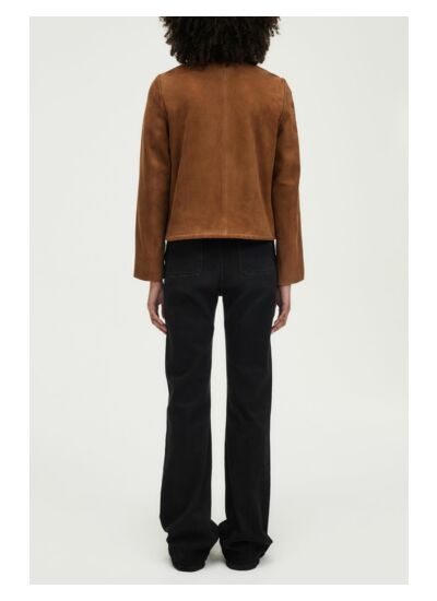 Veste sans col en cuir velours avec des surpiqures ton sur ton décoratives.