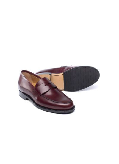 Mocassins pour homme en boxcalf bordeaux, semelle cuir munie d'un patin caoutchouc. Montage Cousu Goodyear.