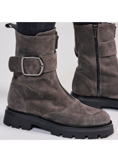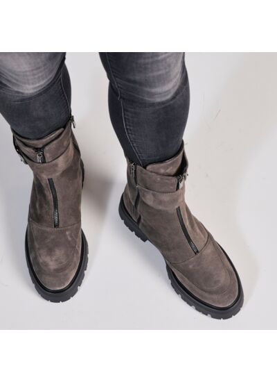 Boots pour femme en cuir velours gris. Détails et bouclé argentés. Zip sur le côté et sur le devant. Semelle gomme.