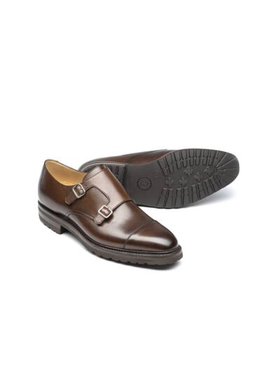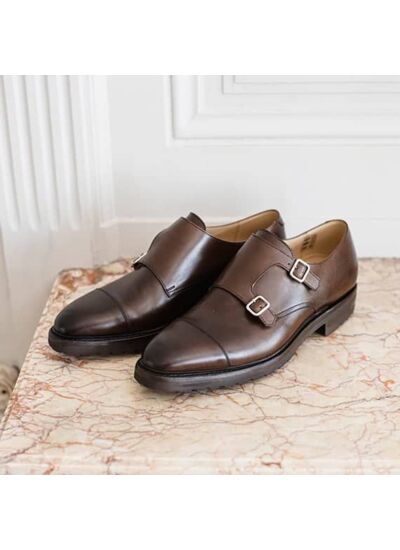 Derby à double boucle pour homme, en cuir patiné marron, semelle gomme X-light. Montage cousu Goodyear.