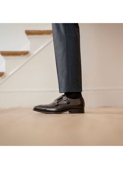 Derby à double boucle pour homme, en cuir boxcalf noir, semelle cuir. Montage cousu Goodyear.