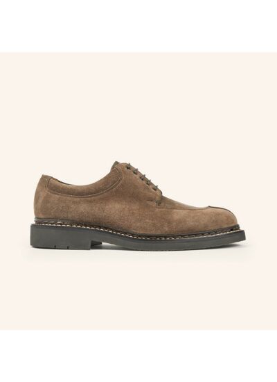 Derby classique, surpiqué au col, bout chasse bombé. Coupé dans un veau velours imperméable, il est monté sur une semelle gomme, selon les préceptes du cousu Norvégien.