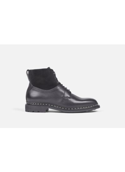 Boots femme à lacets en cuir Anilcalf et Cachemire réalisées en cousu norvégien sur une semelle Ravel en gomme. Décliné au féminin, ce modèle bi-matière s'orne de crochets esprit montagne, il est réalisé en cuir de veau pleine fleur, connu pour sa souplesse, et son col en Cachemire noir soyeux et élégant. Montées sur une semelle gomme et dotées de soufflets d'étanchéité, ces chaussures sont conçues pour convenir à tous les usages.