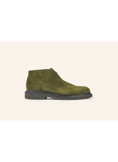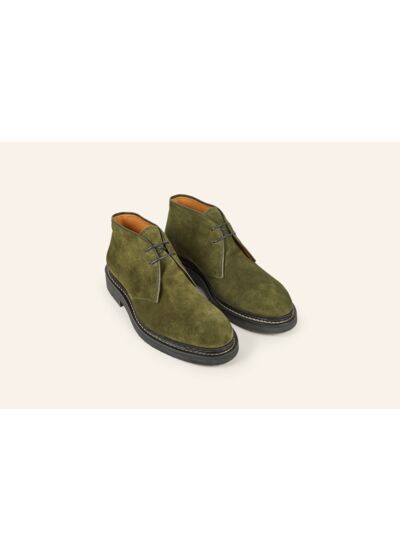 Légère et confortable, la Desert Boot Genêt pour homme revêt, pour l'hiver, une robe veau velours coloris sapin. Monté en cousu Norvégien sur semelle gomme plus légère.