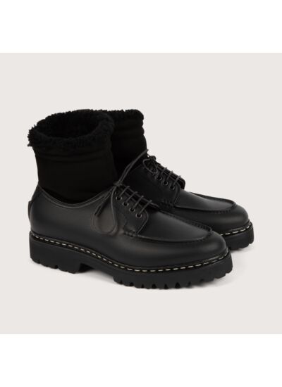 Boots femme en Suportlo et mouton, coloris noir, réalisé en cousu norvégien sur une semelle gomme en caoutchouc naturel. Ce modèle se pare d'un plateau jointé et de quartier à bords anglais associé à un col en mouton fourré avec col de serrage. Son cuir Suportlo, résistant et souple associé à une semelle caoutchouc, en font le compagnon idéal de vos promenades automnales.