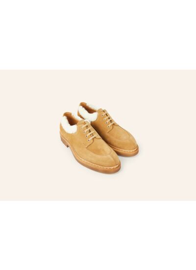Derby femme en Hydrovelours et mouton coloris Dune très confortable avec son cuir Hydrovelours souple et imperméable et sa semelle en caoutchouc légère, il vous accompagnera dans toutes vos balades citadines. À porter avec un pantalon androgyne pour sublimer le côté masculin de ces derbies ou à l'inverse avec une jupe pour souligner leur féminité.