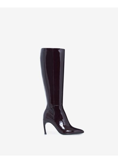 Quelles sont les caractéristiques principales des bottes SOSSO PATENT ? Ces bottes en cuir d'agneau vernis offrent un design élégant avec des bouts pointus et des talons laqués noirs de 8,5 cm, alliant sophistication et confort. Leur fabrication portugaise garantit une qualité artisanale et une durabilité optimale.