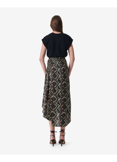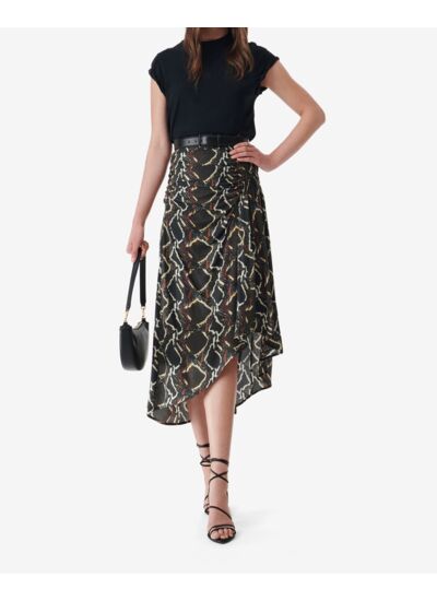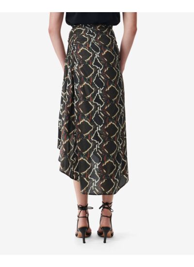 Cette jupe Alessandra taille-t-elle normalement ? La jupe Alessandra taille normalement. Sa coupe taille haute et sa matière fluide assurent un ajustement confortable tout en mettant en valeur la silhouette. Quel entretien nécessite cette jupe imprimée python ? Pour préserver la qualité du tissu en viscose et soie, il est recommandé de laver la jupe à la main ou en cycle délicat à basse température, sans utiliser d’agent blanchissant. Peut-on porter cette jupe en toutes saisons ? Sa composition légère en viscose et soie et sa longueur midi en font une pièce polyvalente, idéale pour le printemps et l’été, mais aussi facilement associable à des collants et boots pour l’automne. Comment styliser la jupe Alessandra pour un look moderne ? Associez-la à un top uni et des accessoires minimalistes pour laisser l’imprimé python s’exprimer, ou combinez-la avec une veste en cuir pour un style audacieux et contemporain. Cette jupe est-elle adaptée à un usage quotidien ? Oui, grâce à sa coupe confortable et sa matière de qualité, la jupe Alessandra allie élégance et praticité pour un port quotidien ou des occasions spéciales.
