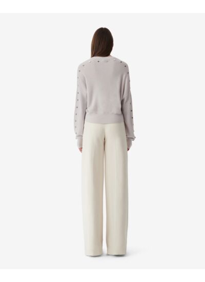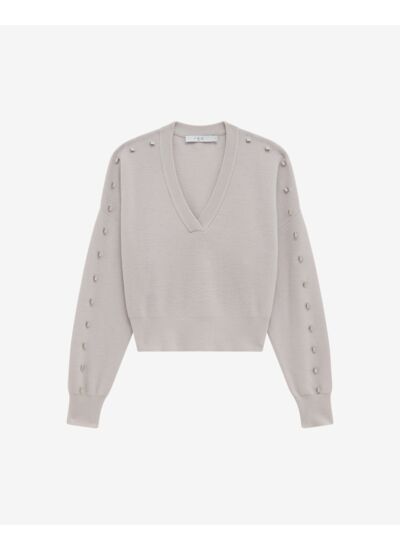 Quelle coupe et style propose ce pull Felipa ? Ce pull oversize présente un col en V élégant et des détails de studs métalliques sur les manches qui apportent une touche moderne et audacieuse, parfaite pour un look casual chic ou urbain.