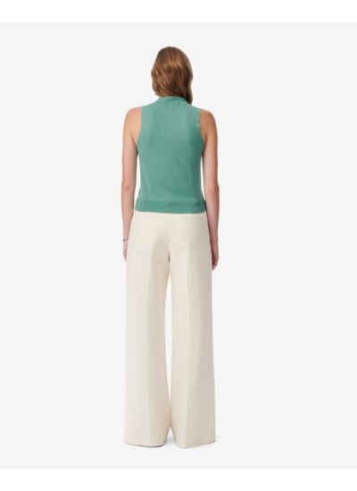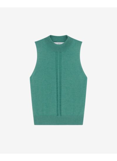 Peut-on porter ce pull sans manches en superposition ? Absolument, son col montant et sa transparence subtile en font une pièce parfaite sous une veste ou un manteau pour un look élégant et moderne.