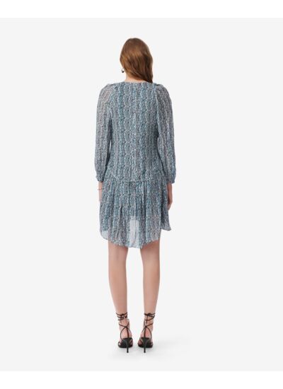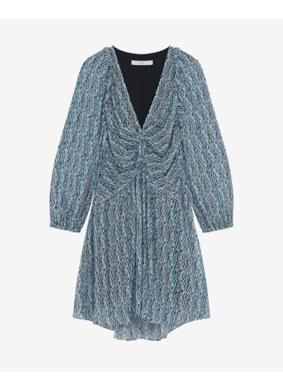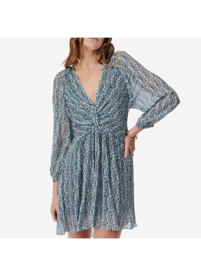 Quelle est la composition de la robe courte à imprimé graphique Ruline ? La robe est confectionnée en 100 % viscose, une matière légère et fluide qui assure confort et élégance tout au long de la journée.