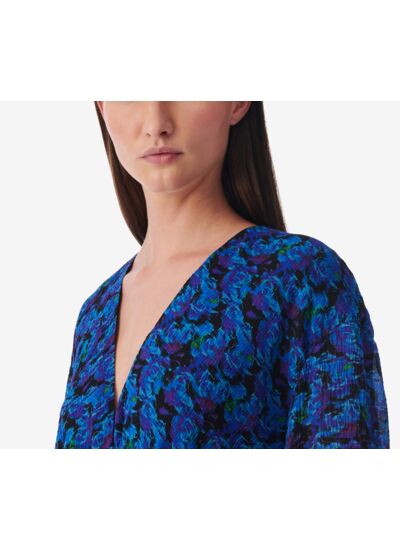 Consultez le guide de taille IroRobe courte imprimée à manches longues NUDICA. Col V et coupe ajustée. Découpes à la taille et détails de volants.