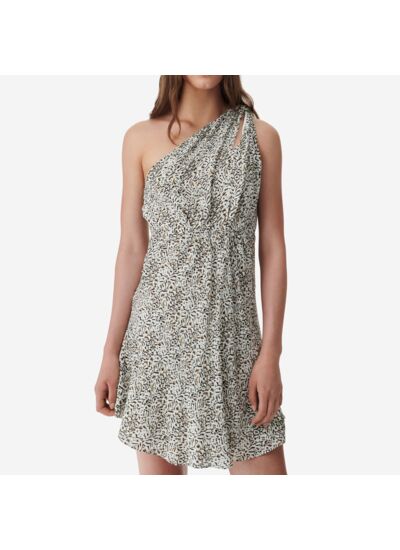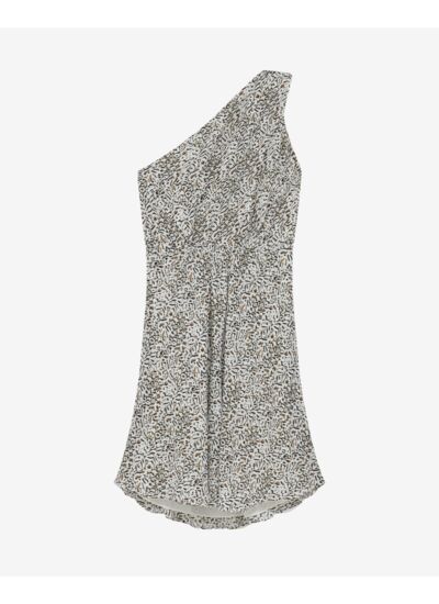 Comment se caractérise la coupe de cette robe imprimée ? Elle présente une coupe ample avec une taille ajustée, un drapé sophistiqué sur le haut et une asymétrie au niveau des épaules qui apporte modernité et originalité à votre silhouette.