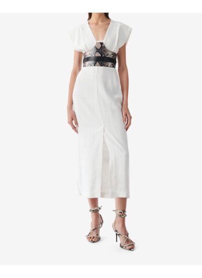Comment est conçue la robe en termes de détails et finitions ? Elle se distingue par une grande fente sur le devant, un jeu de découpe sur le haut et une large ceinture qui structure la taille, le tout sans manches pour un style moderne et raffiné.