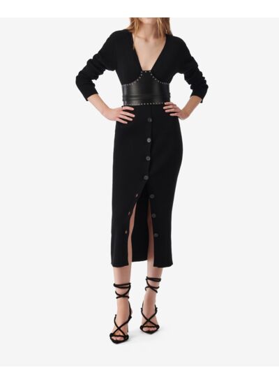 Consultez le guide de taille IroRobe longue côtelée SORAM. Col en V et coupe ajustée. Fermeture avec boutons.