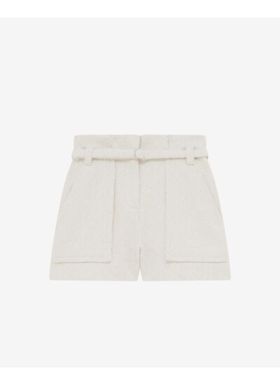 Consultez le guide de taille IroShort en tweed VANAY. Taille haute ceinturée. Fabriqué en Europe.