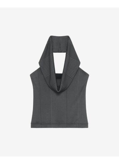 Consultez le guide de taille IroTop à col drapé ROLF. Détails côtelés et dos-nu. Fabriqué en Europe.