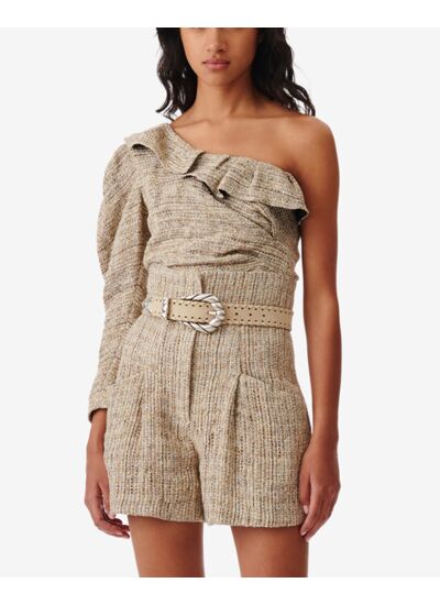 Quelle est la particularité du design asymétrique de ce top ? Les manches asymétriques et les détails de volants plissés créent un effet visuel unique et moderne, faisant de ce top une pièce distinctive qui se démarque dans une garde-robe élégante.