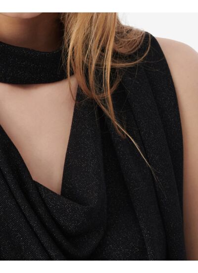 Consultez le guide de taille IroTop drapé en lurex FOA. Encolure montante et fente ouverte dans le dos. Fabriqué en Europe.