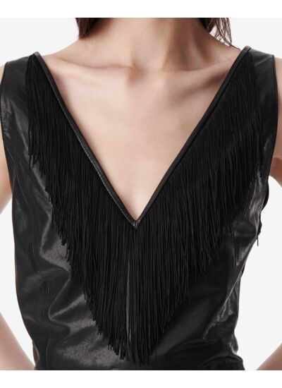 Consultez le guide de taille IroTop en cuir NEO. Franges sur le devant et dans le dos. Coupe courte et col V.