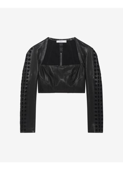 Consultez le guide de taille IroTop raccourci en cuir ADA. Col carré et coupe ajustée. Détails de broderies sur les manches.