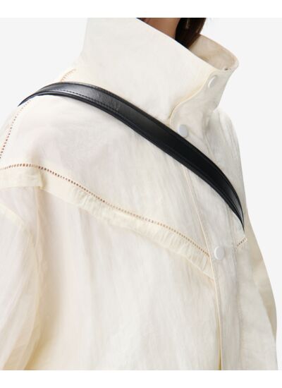 Quels sont les détails qui rendent cette veste unique ? La veste VASHA se distingue par ses manches longues froncées, son col montant et ses empiècements en V sur le devant et le bas, qui apportent structure et modernité à une silhouette ample.