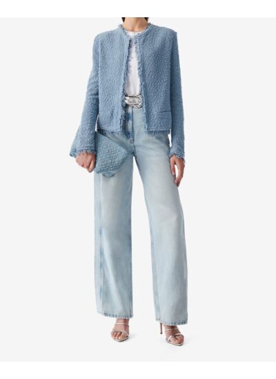 Consultez le guide de taille IroVeste courte à épaules structurées et col rond SHAVANI. Détails à bords frangés. Fabriquée en Europe.