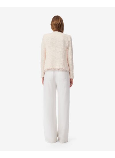 Cette veste convient-elle à toutes les morphologies ? Sa coupe ajustée et ses épaules structurées mettent en valeur la silhouette, tandis que l’absence de fermeture facilite l’enfilage et s’adapte à différentes tailles pour un rendu élégant et moderne.