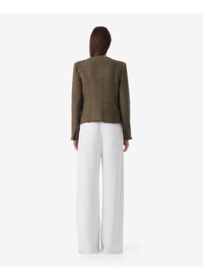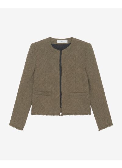 Comment se caractérise la coupe et le style de cette veste ? La Rowy présente une coupe classique avec un col rond et des détails à bords frangés qui apportent une touche élégante et intemporelle. Sa fermeture bord à bord et ses poches avant passepoilées renforcent son allure soignée.