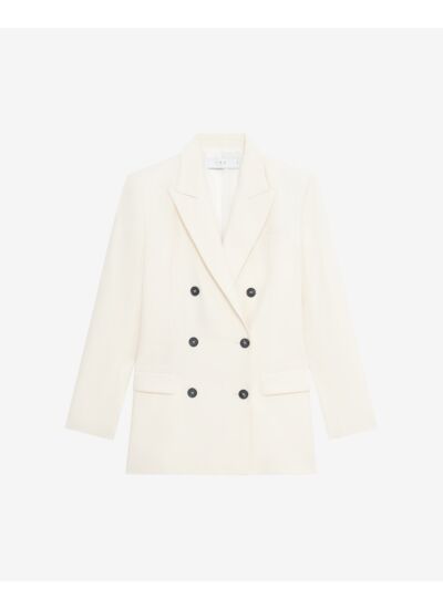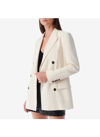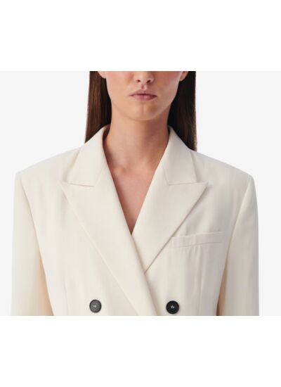Comment est la coupe et la fermeture de cette veste ? La veste KRISTAL présente une coupe ajustée qui souligne élégamment la silhouette. Elle se ferme par un double boutonnage classique, renforçant son style tailleur sophistiqué.