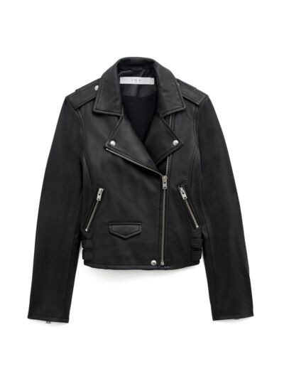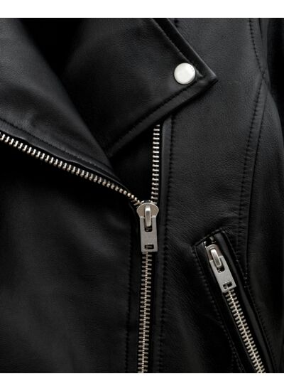 Consultez le guide de taille IroVeste en cuir d'agneau ASHVILLE. Coupe ajustée, fermeture zip asymétrique.