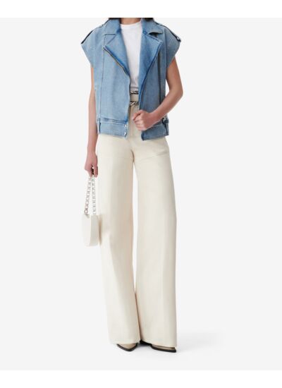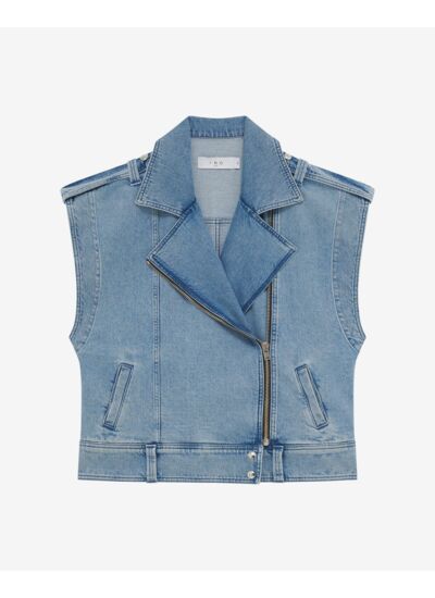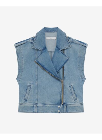 Quels sont les détails qui distinguent cette veste en denim ? Le col perfecto apporte une touche rock et moderne, tandis que les poches passepoilées et la fermeture éclair renforcent son côté pratique et stylé. Les boutons de pression à la taille soulignent la silhouette pour un look affirmé.