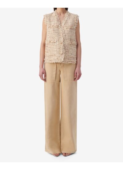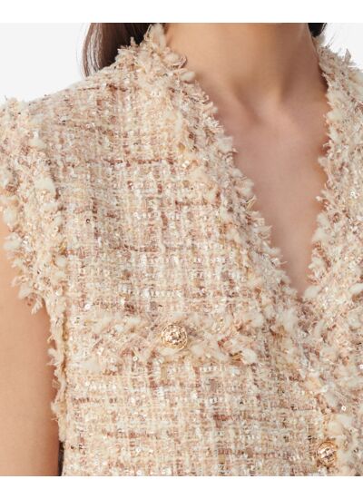 Consultez le guide de taille IroVeste sans manches en tweed OZYA. Col V et bords frangés. Fermeture à boutons dorés.