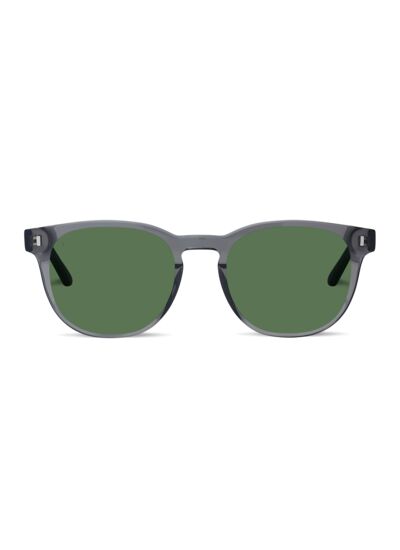 Monture carrée en acétate de cellulose, couleur cristal gris. Protection solaire adaptée aux normes en vigueur. Marque : Jimmy Fairly.
