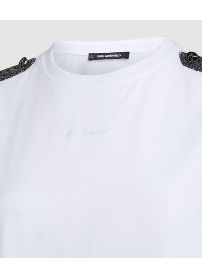 Affirmez votre style avec ce t-shirt Karl Lagerfeld au design unique, sublimé par une boucle délicate qui fait toute la différence. Une pièce essentielle pour moderniser votre garde-robe avec élégance.