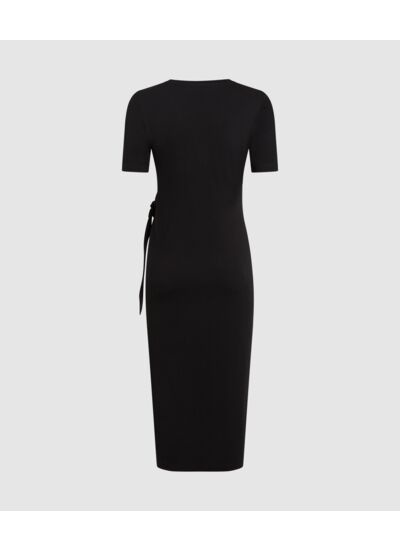 Fabriquée en jersey, elle propose une matière stretch qui assure liberté de mouvement et tenue durable. Sa longueur midi offre une élégance intemporelle, tandis que la taille nouée apporte une touche de féminité raffinée.