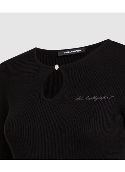 Conçue pour épouser délicatement les formes, cette robe mise sur un détail découpé au niveau du décolleté pour révéler subtilement la peau. Sa maille fine et extensible offre un équilibre parfait entre maintien et liberté de mouvement, idéale pour une journée au bureau comme pour une soirée élégante. Le design minimaliste et sophistiqué reflète l’esprit avant-gardiste de la maison Karl Lagerfeld.