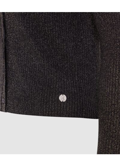 Fabriqué en maille fine avec fil lurex, il présente une fermeture boutonnée classique et des finitions soignées. Disponible en plusieurs tailles, il garantit un ajustement précis et un tombé impeccable.