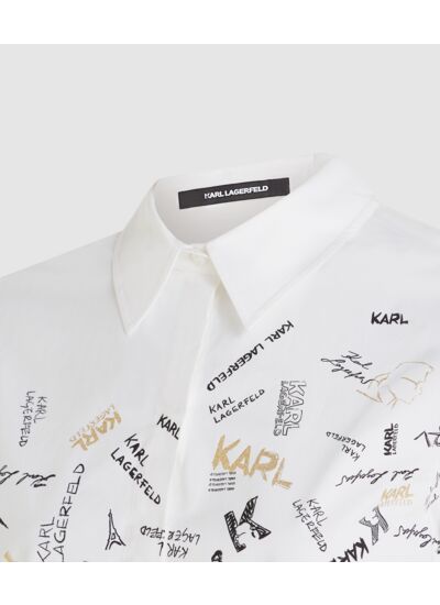Fabriquée en popeline de coton, cette blouse présente une coupe droite, un col classique et des manches longues avec poignets boutonnés. Son imprimé exclusif signé Karl Lagerfeld ajoute une signature distinctive à cette pièce intemporelle.