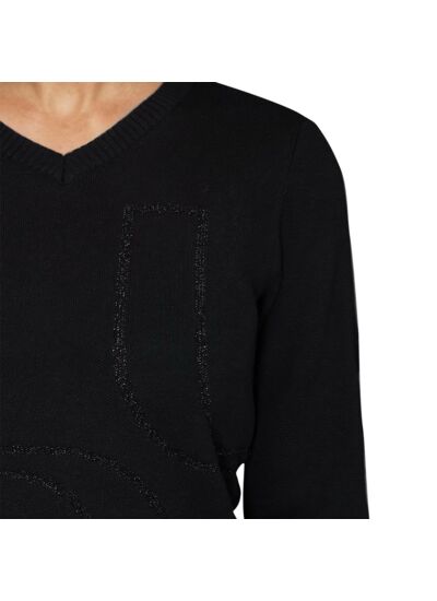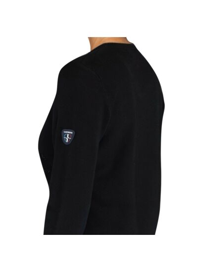 Comment est la coupe et le style de ce pull ? Il présente une coupe légèrement ajustée avec un col en V jacquard piqué, ce qui lui confère une silhouette élégante et moderne. Le logo Lacroix oversize en fil lurex ajoute une touche subtile de fantaisie sans compromettre le raffinement.
