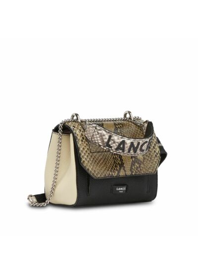 Description : Jeune et accessible, Ninon de Lancel est notre ligne de sacs mode et urbains, à porter de jour comme de nuit. Moderne et multifacette avec sa bandoulière chaîne et cuir coulissante offrant un multi-portés ingénieux, Ninon de Lancel se caractérise par son style graphique et affirmé. Eléments signature de cette ligne à forte personnalité, la poignée maxi logo, les détails bombés et le zip asymétrique lui confèrent un look rock et tendance. Les sacs sont confectionnés dans un cuir de vachette au grain rond et léger, offrant un rendu structuré et souple à la fois.