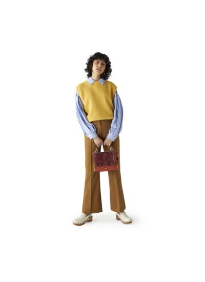 Comment porter le sac NINON pour un style polyvalent ? Grâce à sa bandoulière chaîne et cuir coulissante, ce sac se porte facilement à l’épaule ou en crossbody. Sa poignée maxi logo amovible permet également un porté main, offrant un look graphique et affirmé adapté au jour comme à la nuit.