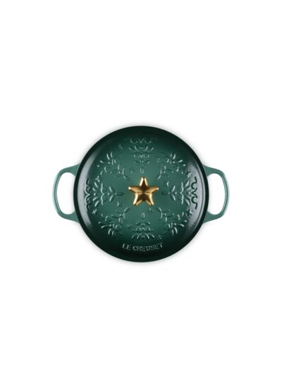 Cette cocotte de Noël est une superbe pièce maîtresse qui apportera à coup sûr de la joie à votre cuisine et à votre table pendant les fêtes. Ce modèle en fonte émaillée est orné d’un délicat motif d’arbres embossé sur le couvercle et doté d’un bouton en forme d’étoile doré. Sa forme et sa taille polyvalentes sont idéales pour toutes sortes de recettes, de la cuisson au four et au rôti, à la cuisson lente et plus encore.
