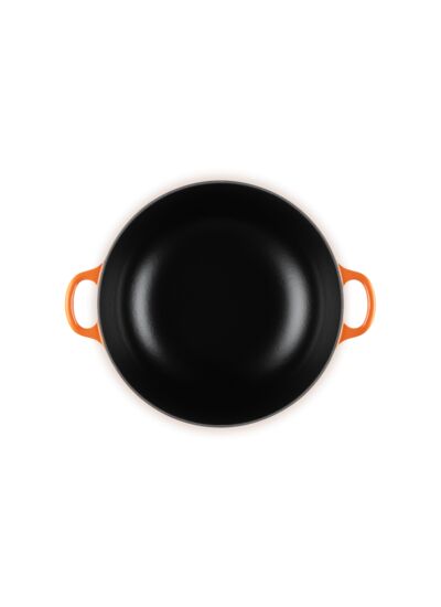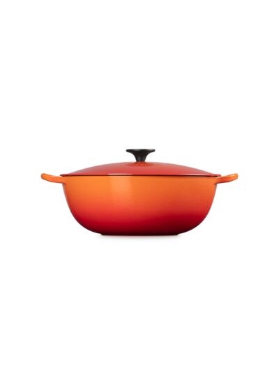 Idéale pour préparer des soupes, pour monter des sauces ou pour faire mijoter un bouillon, cette cocotte polyvalente présente des parois incurvées qui favorisent le mouvement et facilitent le brassage. L’intérieur en émail noir est parfait pour préparer des sautés et faire blondir vos cuissons. Fabriquée dans notre fonte émaillée emblématique et de taille pratique, cette pièce passera de votre cuisine à la table avec grâce.